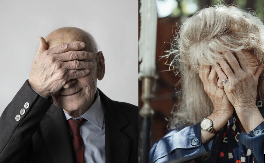 Das Foto zeigt 2 ältere Menschen, die in eine Depression gefallen sind. Plötzlich ist alles ganz schwer. Die Hände vor dem Gesicht machen das deutlich.
